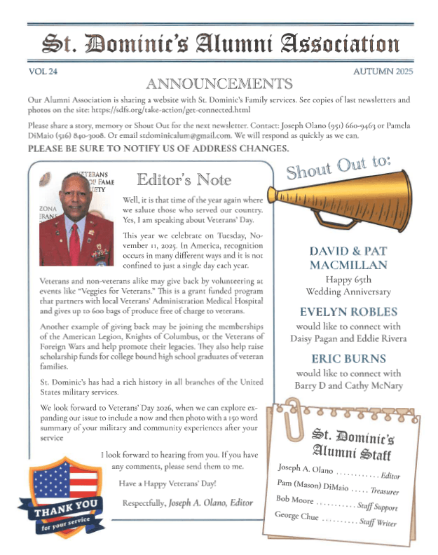 The mission of the Saint Dominic’s Family Services Alumni Association is to rekindle old friendships and to make new ones.